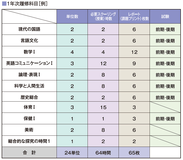 1年次は高等学校を卒業するために必要な国で定められている科目<必履修科目>を中心に取得します。